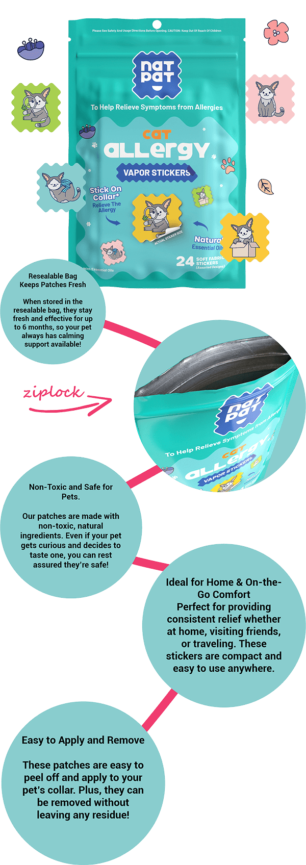 Our patches are made with non-toxic, natural ingredients. Even if your pet gets curious and decides to taste one, you can rest assured they’re safe!
