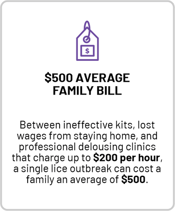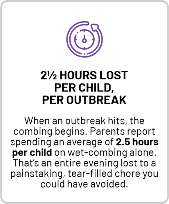 Problem: A single outbreak means an average of 2.5 hours of painstaking, tear-filled wet-combing per child. It’s a battle of tangled hair, a sore back for you, and an uncomfortable, upsetting experience for them.