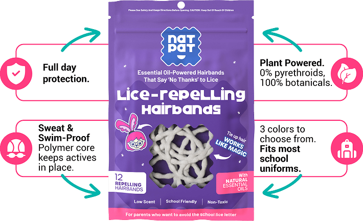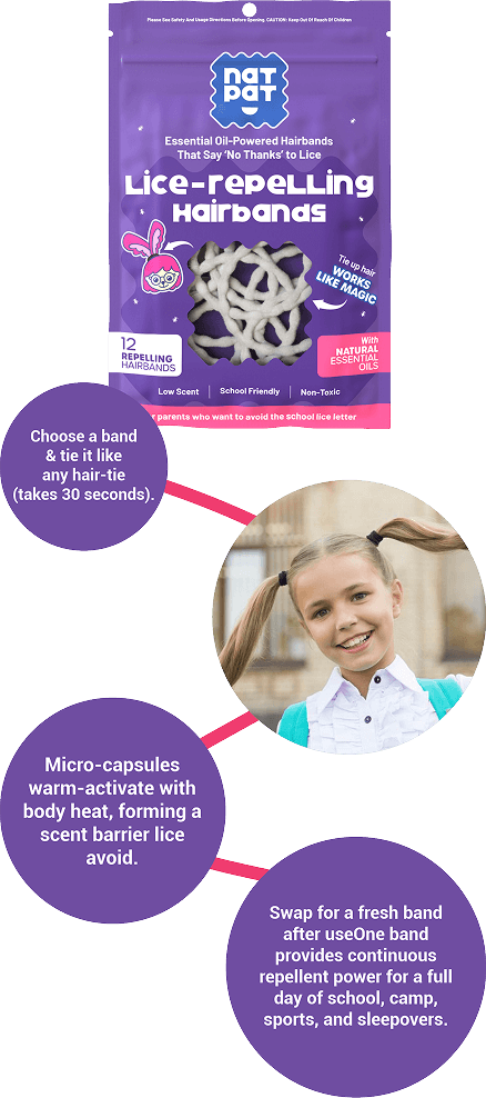 Solution: Our repellent hairbands give you proactive peace of mind. One 30-second ponytail in the morning creates an invisible shield powered by plant-based repellents. When the school notice goes out, you can feel calm and confident knowing your child is already protected.